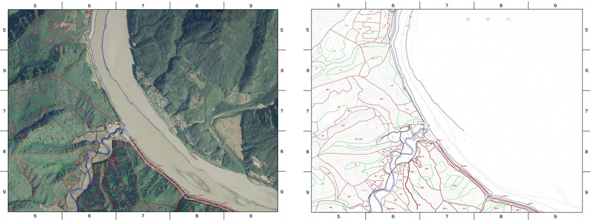 既存の航空写真を利用して、写真測量により図化作業を行い、当時の現況を再現することにより道路判定等の根拠資料としてお使い頂けます。
